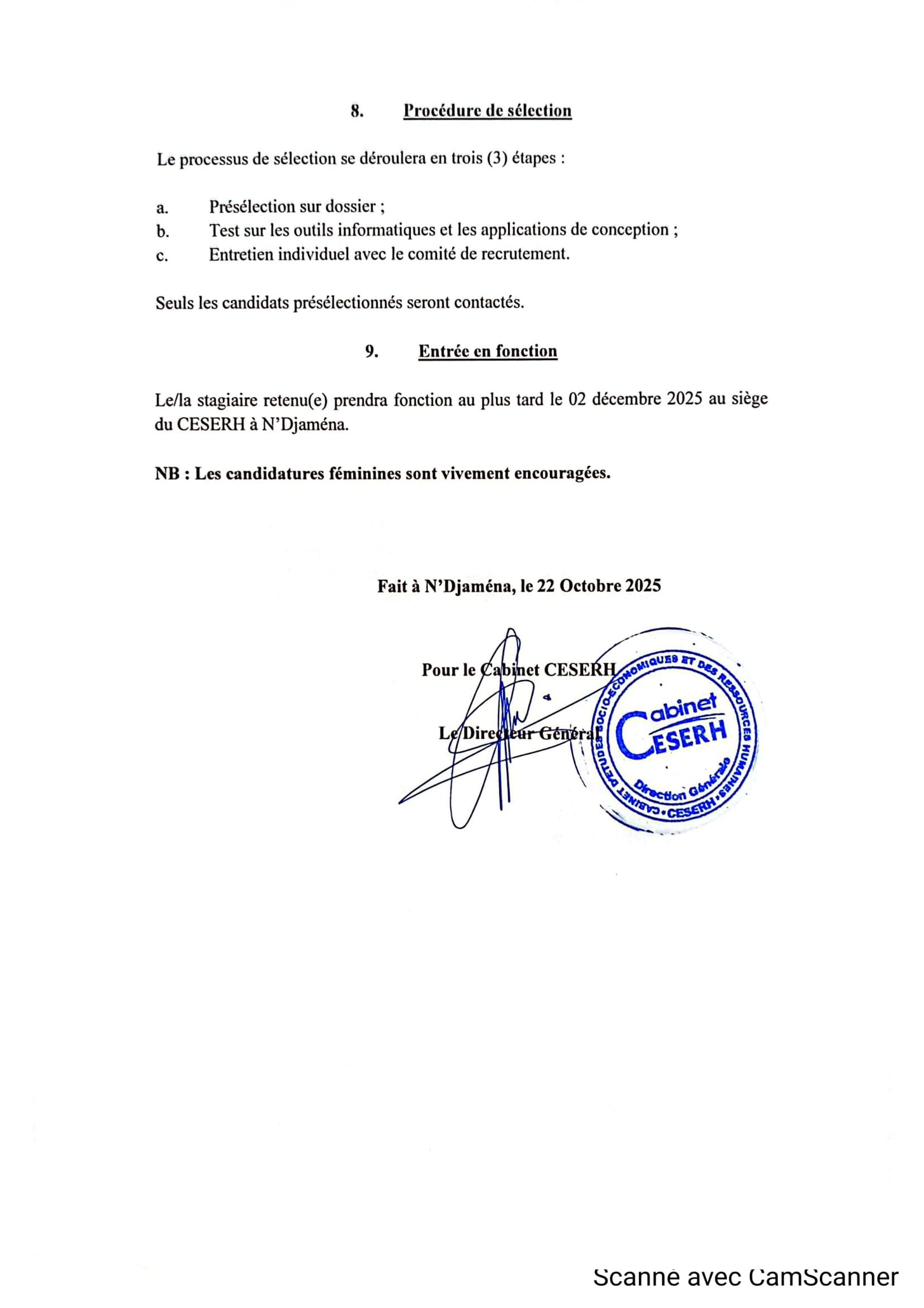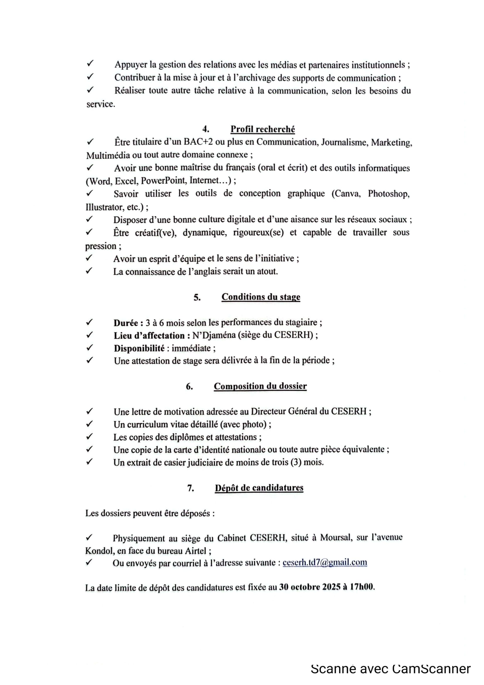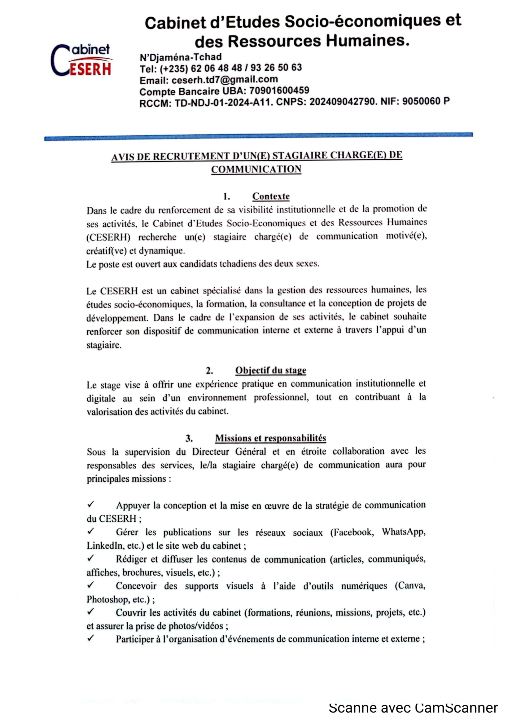 Accueil » Opportunités » Afrique » Tchad » Le Cabinet CESERH basé à N’Djamena recherche un Stagiaire chargé de communication (H/F), Tchad