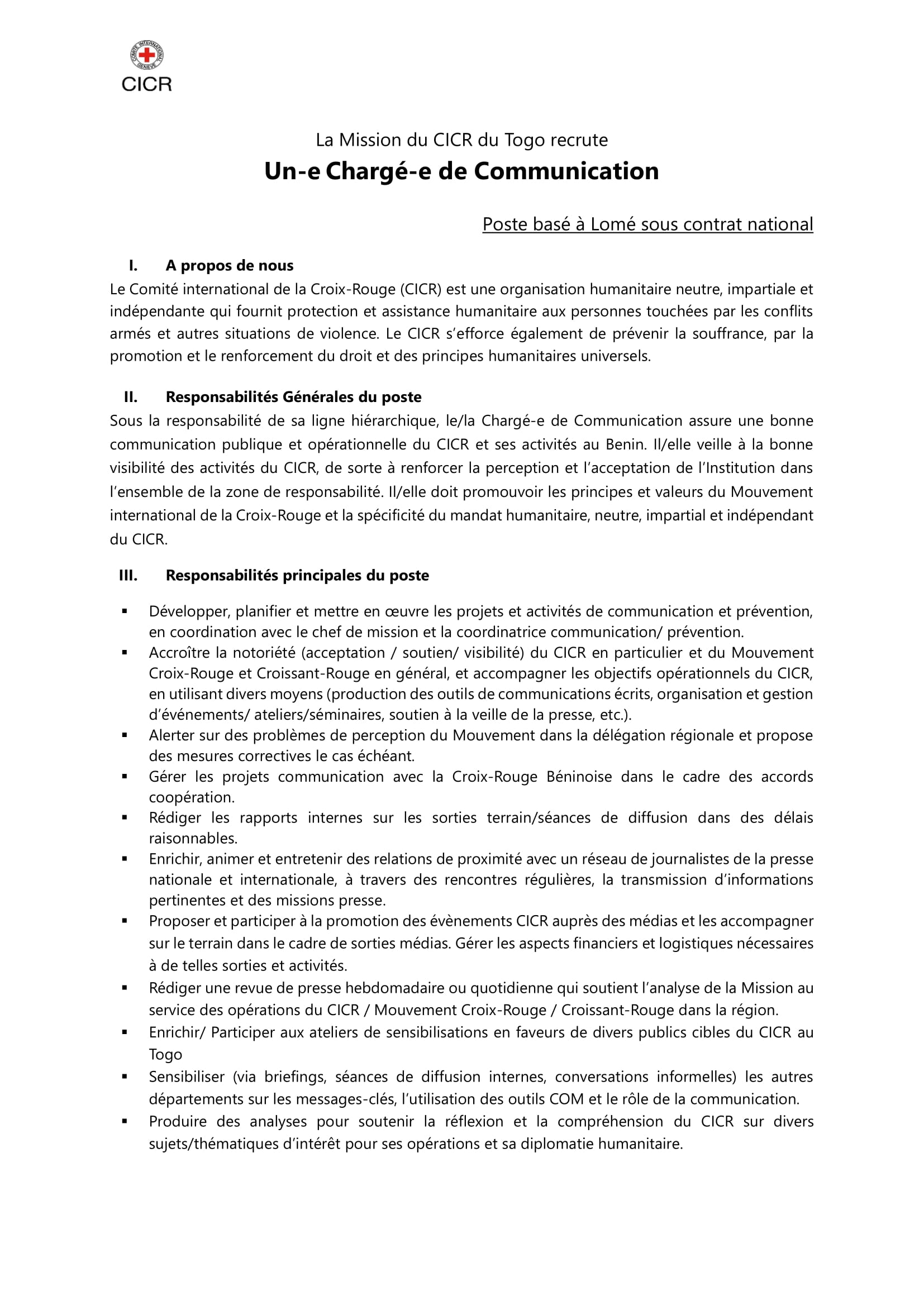 Accueil » Opportunités » Afrique » Togo » Le Comité International de la Croix-Rouge (CICR) au Togo recherche un(e) Chargé(e) de Communication, poste basé à Lomé