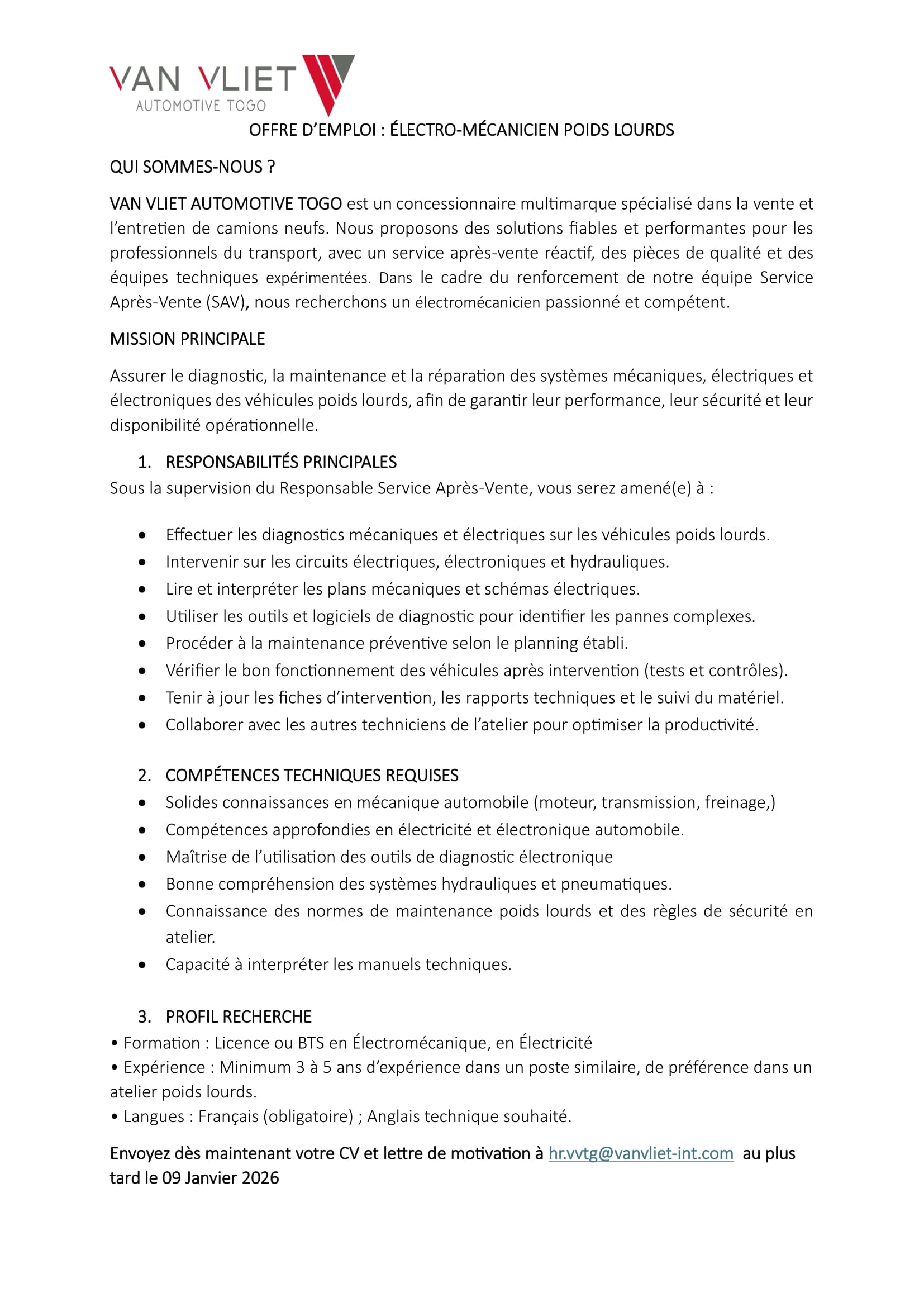 Accueil » Opportunités » Afrique » Togo » VAN VLIET recherche un Stagiaire électromécanicien, Togo